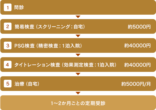 SASが疑われる方には、問診を行い、スクリーニングである簡易検査(自宅で行う)を行います。簡易検査の結果が軽症~中等症の場合PSG検査(1泊入院)行います。睡眠時無呼吸症候群と確定診断された場合には、治療のための効果測定の検査入院(タイトレーション)を施行します。結果をもとにご自宅での治療が開始されます。
