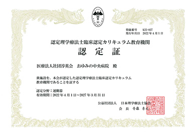 当院は、千葉県内で4施設のみが認定されている『運動器』分野の臨床認定カリキュラム教育機関として、日本理学療法士協会より認定を受けております。